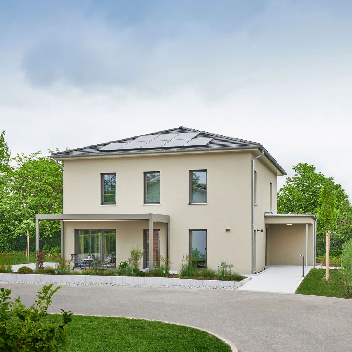 Das Musterhaus UrbanLife hat Außenmaße von zehn mal zehn Metern, ein flaches Walmdach und wurde auf Bodenplatte errichtet. Ein Erker ergänzt die quadratische Grundfläche und schafft damit die Möglichkeit, eine Eingangsüberdachung im Hauswinkel zu platzieren. Die natürliche Farbe der Putzfassade und die symmetrische Anordnung der quarzgrauen Fenster verleihen der modernen Stadtvilla eine hochaktuelle Optik. Im Erdgeschoss der zweigeschossigen Stadtvilla sind bodentiefe Fenster zu finden, während im Obergeschoss Fenster mit einer niedrigen Brüstung eingesetzt wurden. Die fast unsichtbare gläserne Absturzsicherung ist ein weiteres modernes Gestaltungselement.